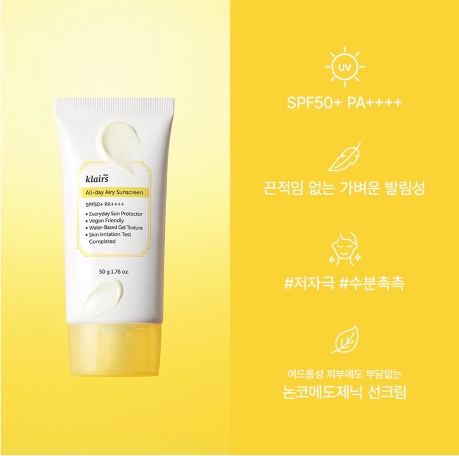 SPF 50+ PA++++ бүхий энэхүү чийгшүүлэх үйлчилгээтэй нарны тос нь түрхсэний дараа арьсыг цайруулж, хөхрүүлэхгүйгээр арьсыг нарны хэт ягаан туяанаас хамгаална. Химийн фильтртэй нарны тоснуудыг эмзэг арьсанд зөвлөдөггүй. Гэхдээ өндөр технологи, нарийн судалгааны үр дүнд арьсанд зөөлөн орцуудыг оруулсан тул энэхүү нарны тосыг эмзэг, хуурай, тослог гээд бүх төрлийн арьсанд хэрэглэх боложтой. Хөнгөн бүтэцтэй, хүнд тослог мэдрэмж төрүүлэхгүй.